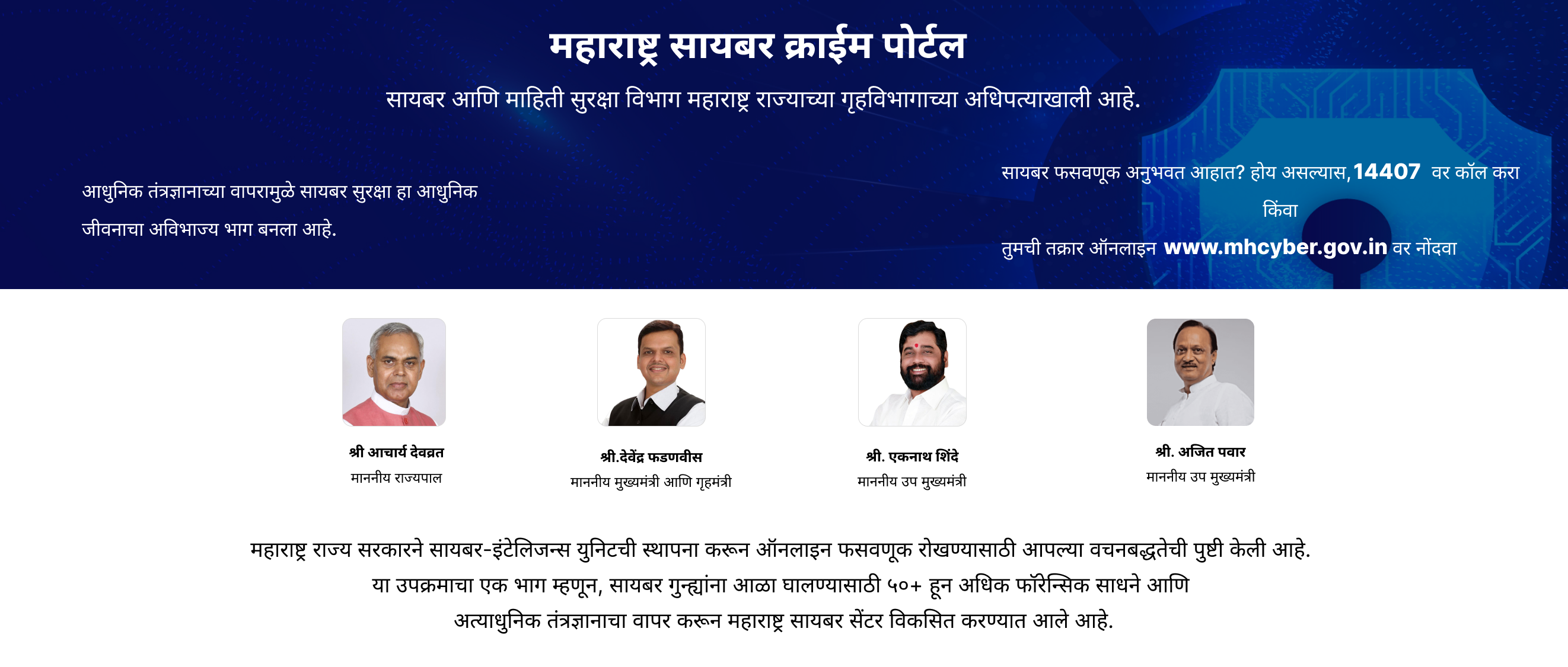 २०१६ मध्ये स्थापित, “महासायबर विभाग” महाराष्ट्रात सायबर गुन्ह्यांशी संबंधित समस्यांशी प्रभावीपणे निपटण्यासाठी एक अग्रगण्य संस्था आहे. भारतातील प्रमुख समर्पित सायबर सुरक्षा विभागांपैकी एक म्हणून, महासायबर सायबर धोख्यांच्या वाढत्या आव्हानांचा सामना करण्यासाठी एक बहुआयामी दृष्टिकोन स्वीकारतो. आमचे लक्ष्य सायबर गुन्ह्यांची ओळख, प्रतिबंध आणि दोषारोपण करण्यासोबतच महाराष्ट्रातील नागरिकांमध्ये सायबर सुरक्षाबद्दल जागरूकता वाढवण्यावर आहे.
